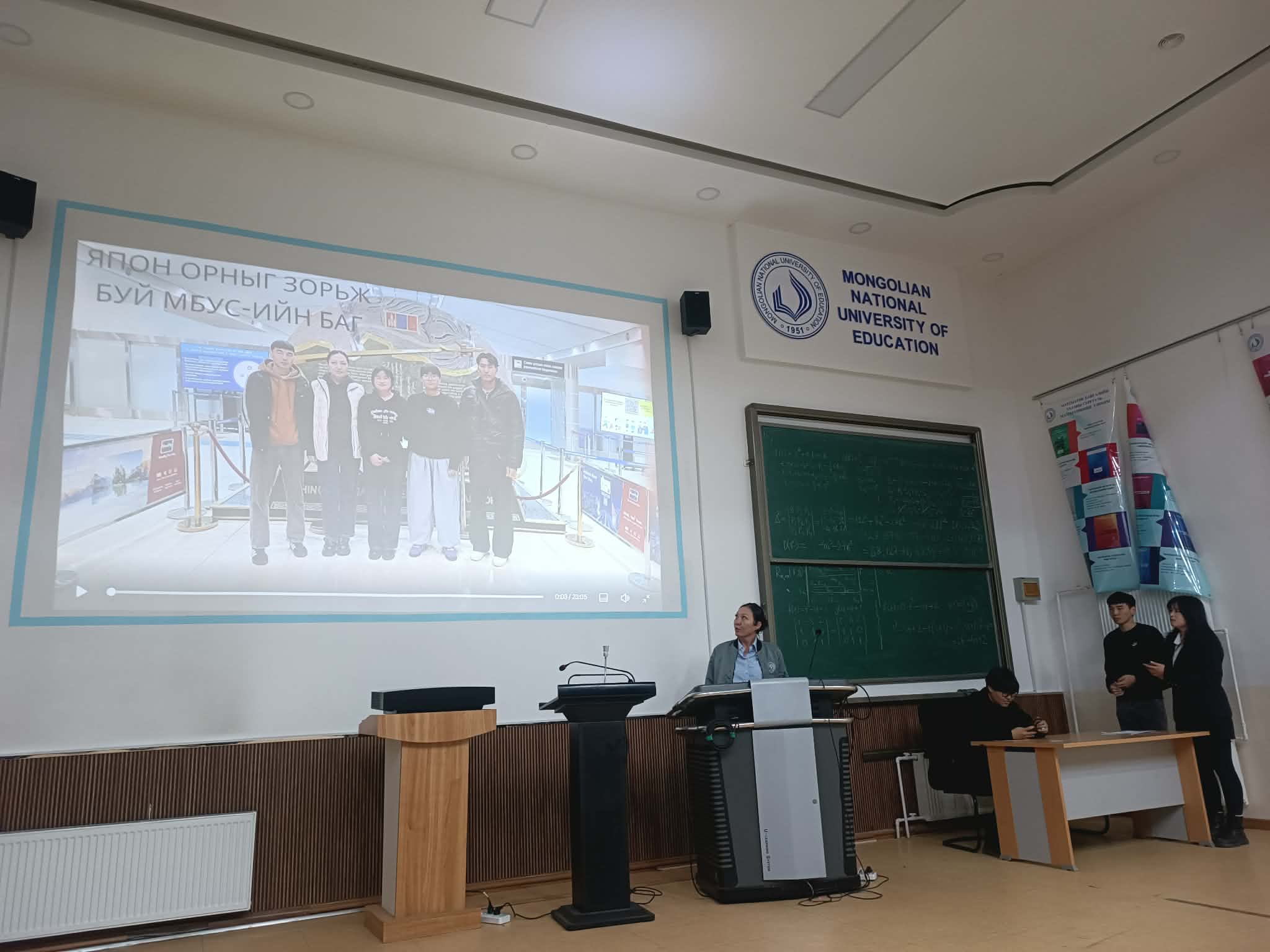 нар тус хөтөлбөрт хамрагдав. Тус айлчлалын үеэр “Айчи” Боловсролын их сургуулийн удирдлагууд МУБИС-ийн багийг хүндэтгэлтэйгээр хүлээн авч уулзан, хоёр талын хамтын ажиллагааг өргөжүүлэх талаар санал солилцов. Мөн төлөөлөгчид Шинжлэх ухаан–Моноцүкүри фестивальд идэвхтэй оролцож, Оказаки бага, дунд сургуулийн орчин, хичээл заах арга зүйг ажиглан танилцсан нь оюутан, багш нарт чухал туршлага болохуйц байлаа. Монголын соёлыг япон оюутнуудад таниулах соёлын өдөрлөг зохион байгуулж, хоёр улсын оюутнууд үзэл бодол, уламжлалаа харилцан солилцсон нь томоохон ач холбогдолтой үйл явдал боллоо. Үүнээс гадна төлөөлөгчид Нагоя хотын шинжлэх ухааны музей, Инүяма цайз зэрэг соёл, түүхийн ач холбогдолтой газруудаар зочилж, мэдлэгийн хүрээгээ тэлэн, олон талын шинэ туршлага хуримтлуулсан юм. МБУС-аас оролцсон баг хамт олон Япон улсад хийсэн сургалт, туршлагынхаа үр дүнг олон нийтэд хүргэх зорилгоор 2025 оны 12-р сарын 08-ны 14:00 цагт, Хичээлийн 3-р байрны 123 тоот лекцийн танхимд оюутан залуусдаа зориулсан тайлангаа тавьж,сонирхолтой мэдээлэл, сэтгэгдлээ хуваалцлаа.