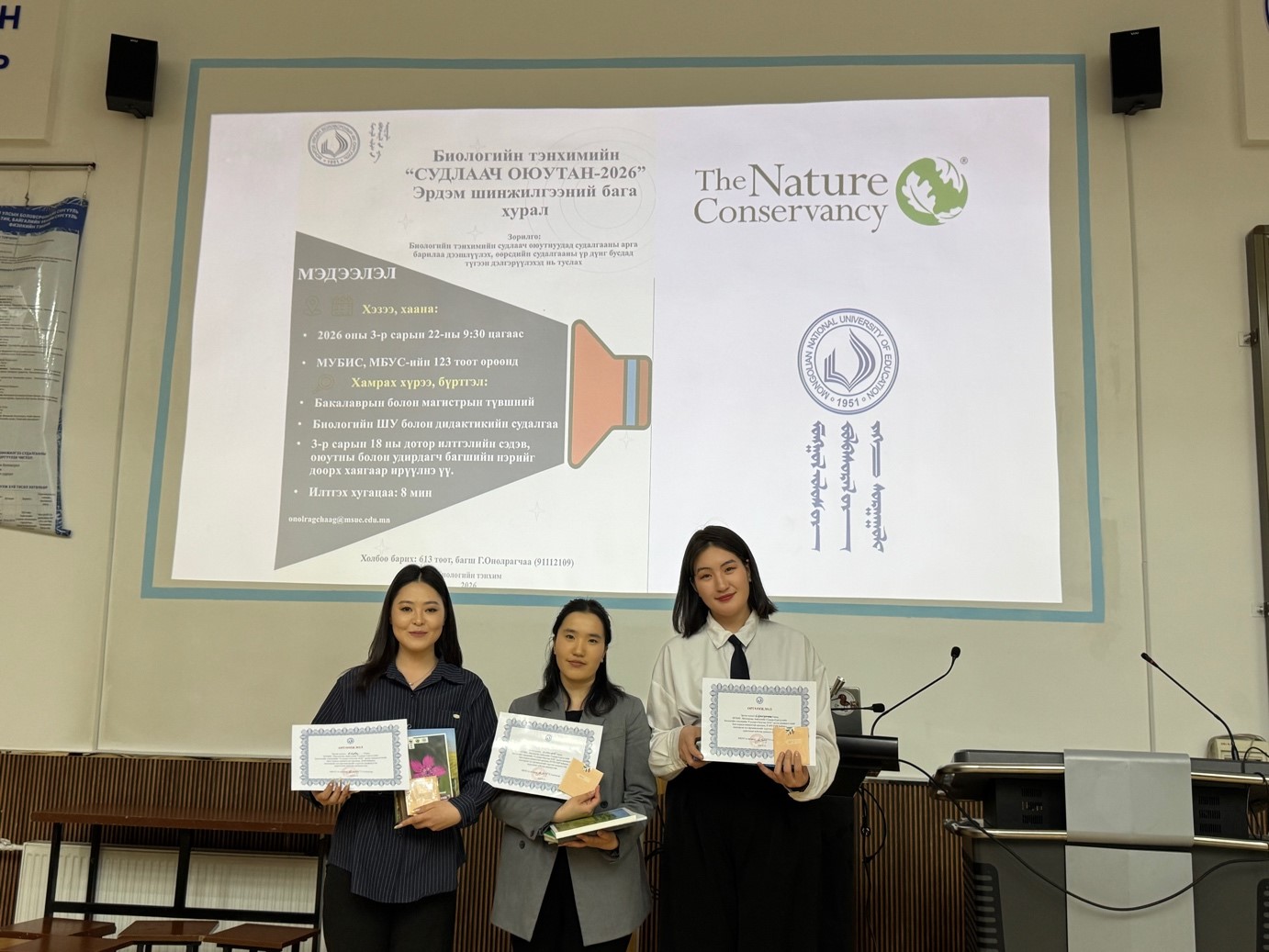 3-р байранд: Биологийн 4 ангийн оюутан Н.Нямжав “Хустайн Байгалийн Цогцолбор газрын Монгол тарваганы зан төрхийн судалгаа” сэдвээр тус тус эзэллээ.