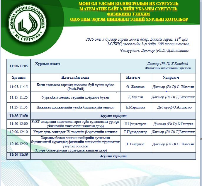 МБУС-ийн физикийн тэнхимийн 2025-2026 оны хичээлийн жилийн оюутны эрдэм шинжилгээний хурал 2026 оны 3 дугаар сарын 20-ны өдөр МУБИС-ийн хичээлийн 3 дугаар байрны 308 тоот танхимд зохион байгуулагдав. Эрдэм шинжилгээний хуралд хурлыг зохион байгуулах комисст О.Алтангоо, Б.Гандөш, Б.Гантуяа, Д.Батхишиг, А.Нэргүй нар ажилласан бөгөөд хуралд нийт 6 оюутан илтгэл хэлэлцүүлсэн.