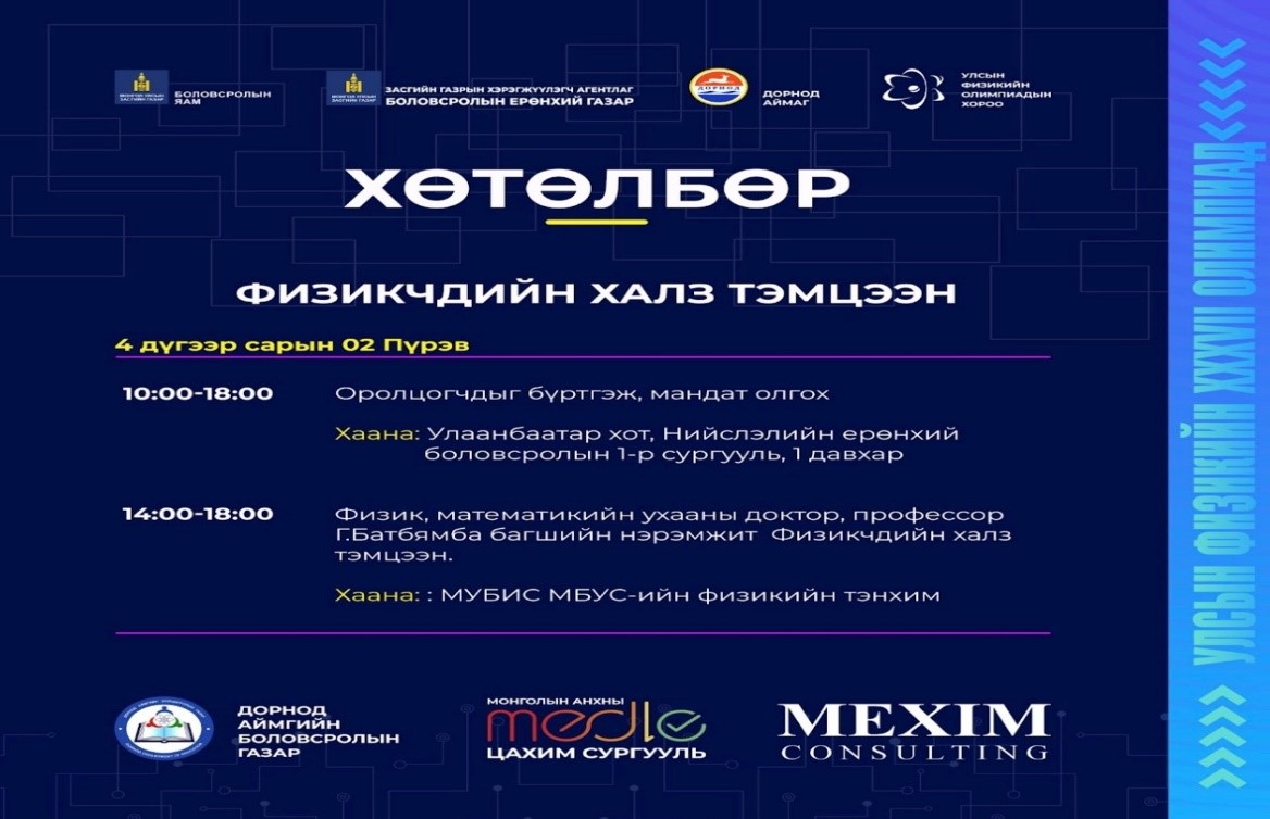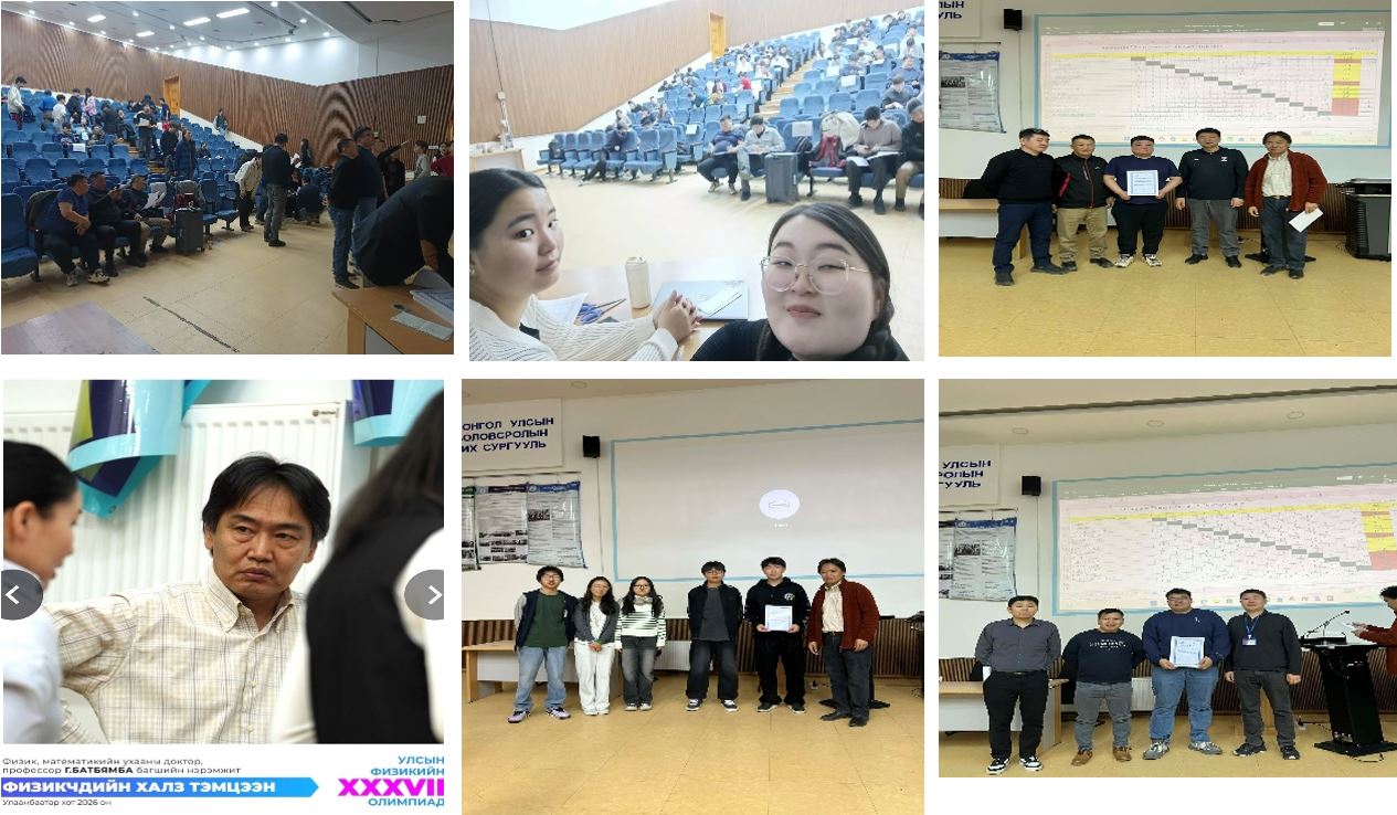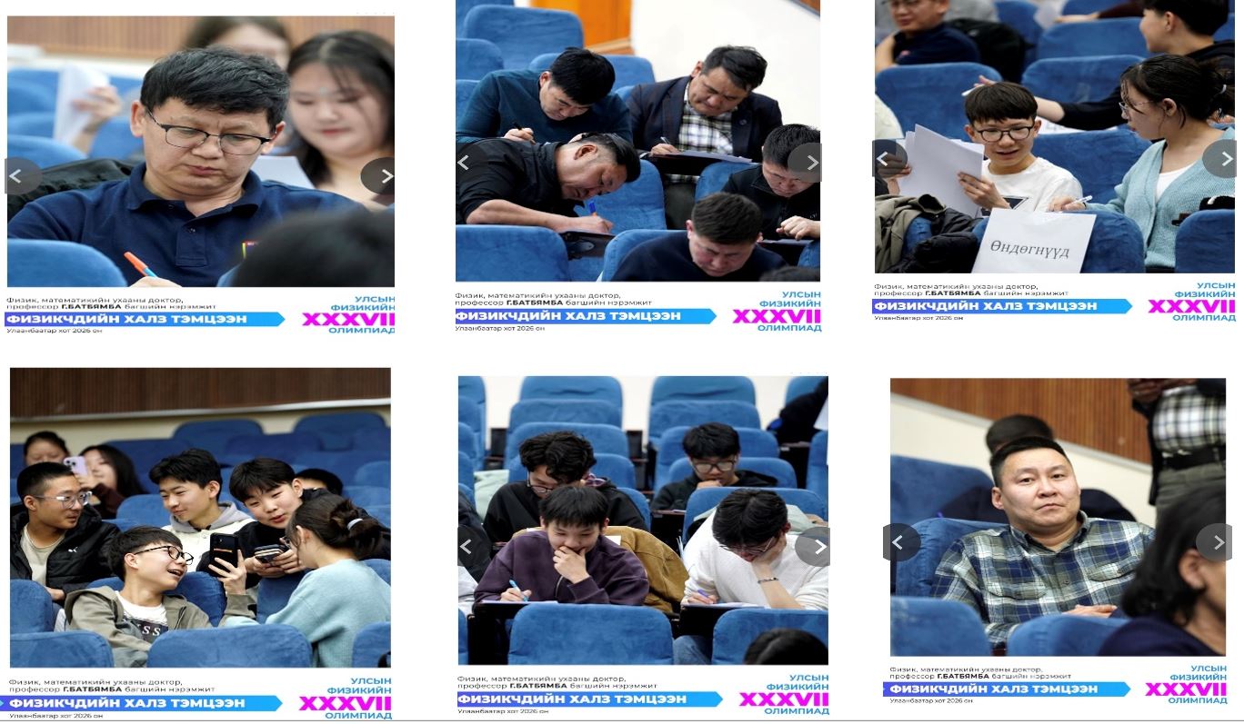 МБУС-ийн  ФИЗИКИЙН ТЭНХИМИЙН 2025-2026 оны хичээлийн жилийн “ФИЗИКЧДИЙН ХАЛЗ” олимпиадыг Физикийн шинжлэх ухааныг нийтэд сурталчлах, туршлага, мэдлэгээ хуваалцах зорилгоор жил бүр зохион байгуулдаг билээ. “ФИЗИКЧДИЙН ХАЛЗ ТЭМЦЭЭН”-ийг МУБИС-ийн Физикийн тэнхимийн төгсөгч, ахмад багш доктор (PhD) профессор Гүржавын Батбямбын нэрэмжит болгон 2026 оны 4 дүгээр сарын 03-ны өдөр МУБИС-ийн хичээлийн 3 дугаар байрны 123 тоот танхимд зохион байгуулагдав.  Тус олимпиадын тэнхимийн багш, ажилчид, тэнхимийн оюутнууд зохион байгуулах комисст ажилласан бөгөөд олимпиад нийт нийт 16-н баг, баг тус бүр 5-н гишүүнтэй оролцсон.